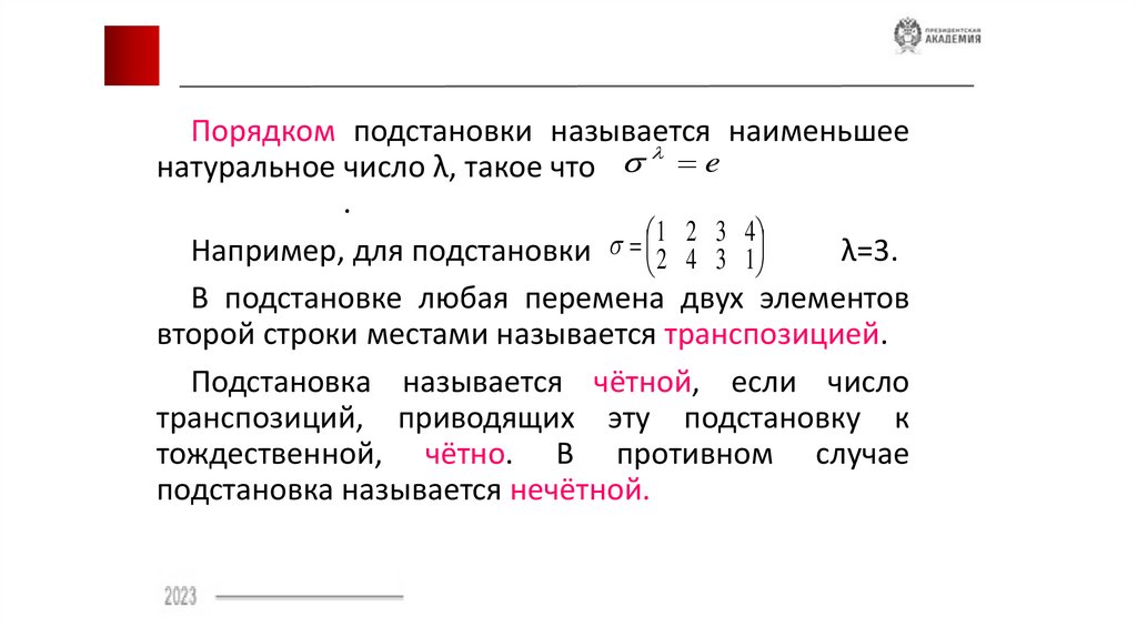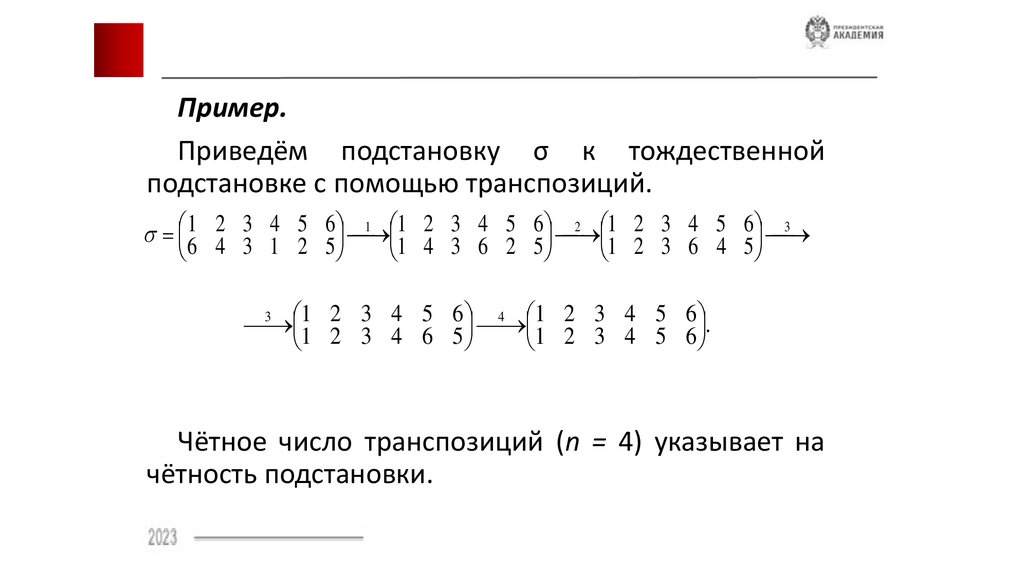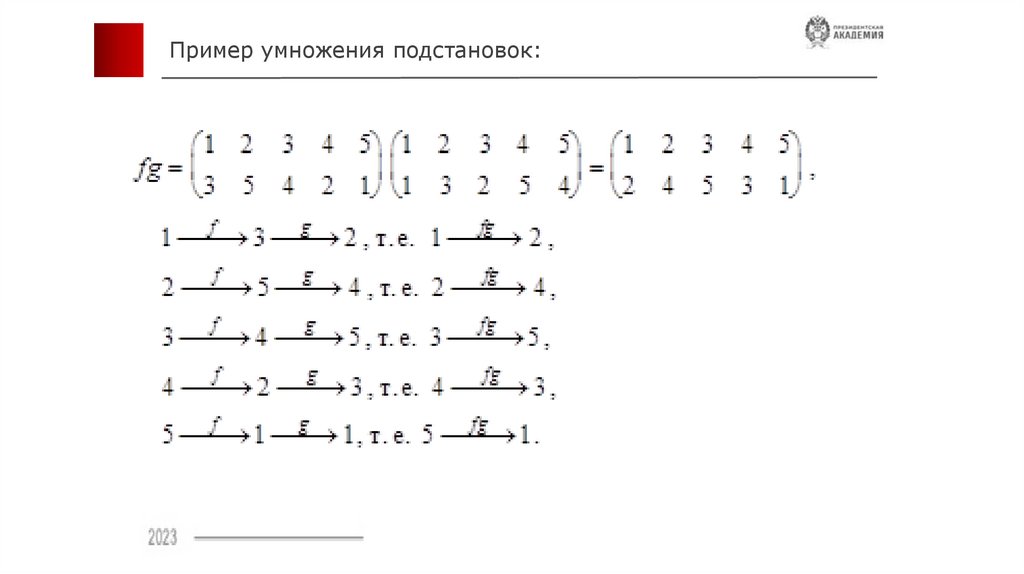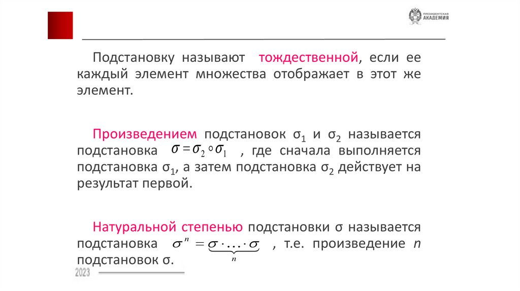 Подстановку называют тождественной, если еекаждый элемент множества отображает в этот же