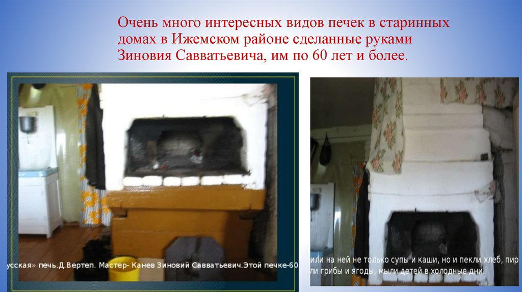 Очень много интересных видов печек в старинныхдомах в Ижемском районе сделанные руками