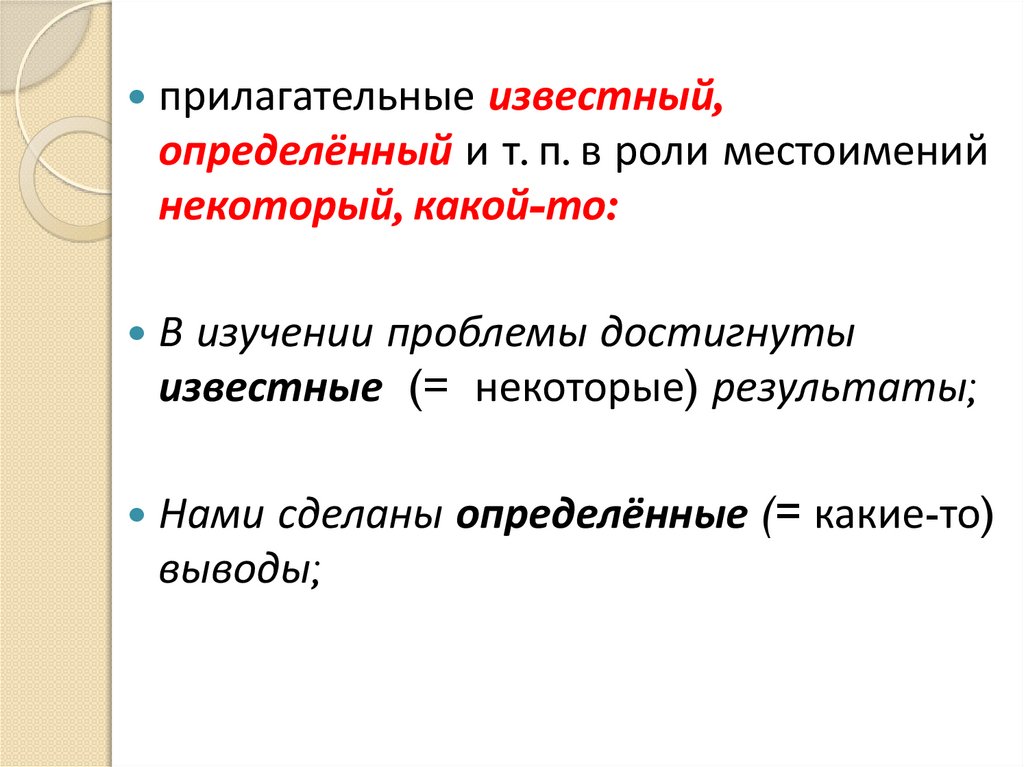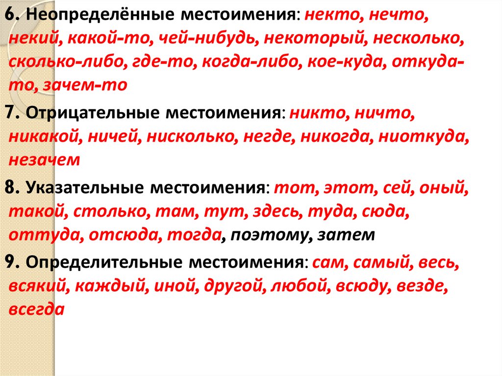6. Неопределённые местоимения: некто, нечто,некий, какой-то, чей-нибудь, некоторый, несколько,