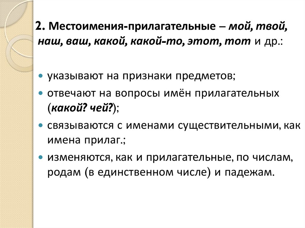 2. Местоимения-прилагательные – мой, твой,наш, ваш, какой, какой-то, этот, тот и др.: