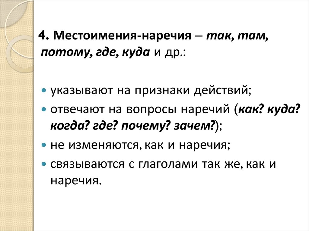 4. Местоимения-наречия – так, там,потому, где, куда и др.: