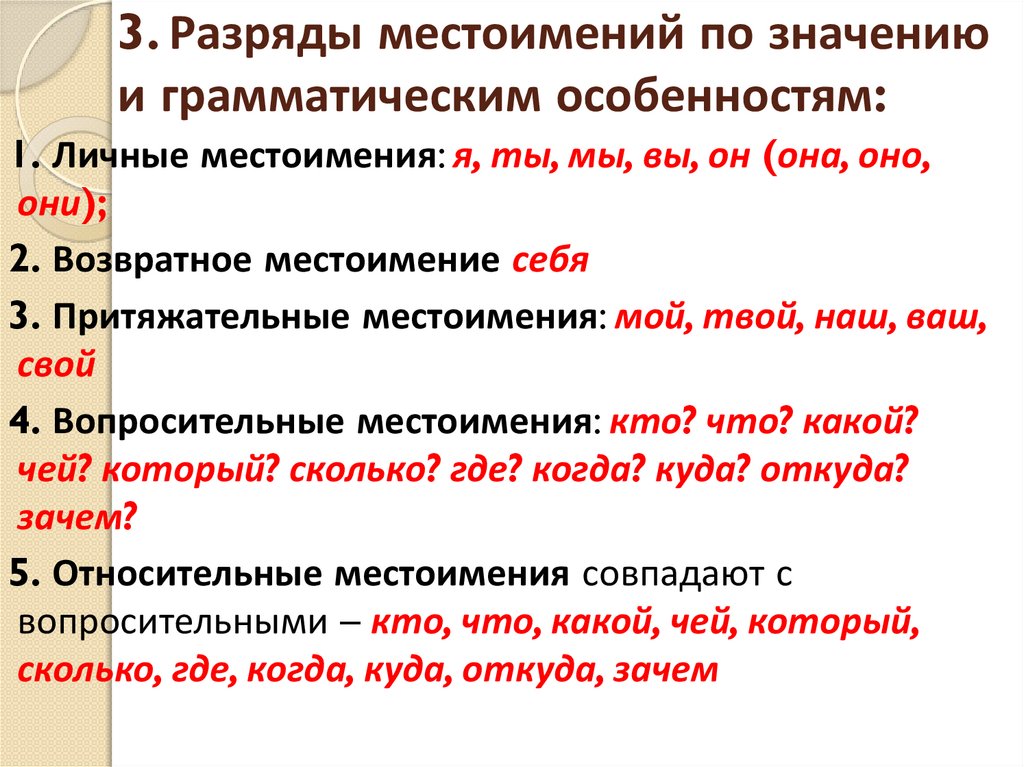 3. Разряды местоимений по значениюи грамматическим особенностям: