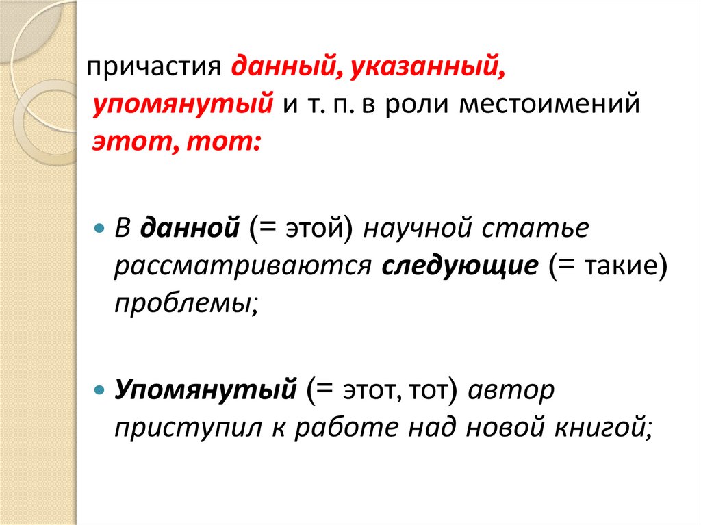 причастия данный, указанный,упомянутый и т. п. в роли местоимений