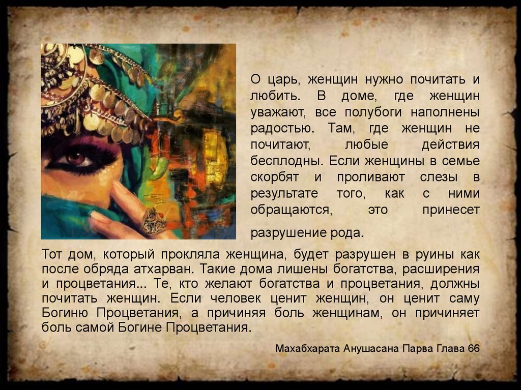 О царь, женщин нужно почитать илюбить. В доме, где женщин