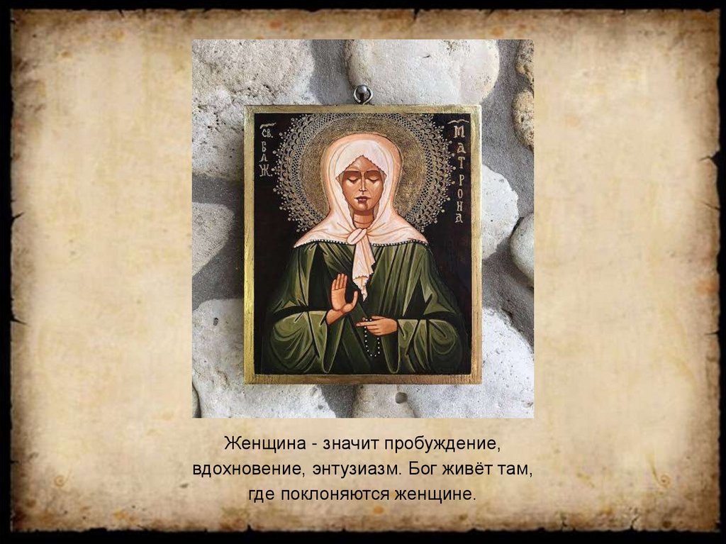 Женщина - значит пробуждение,вдохновение, энтузиазм. Бог живёт там,