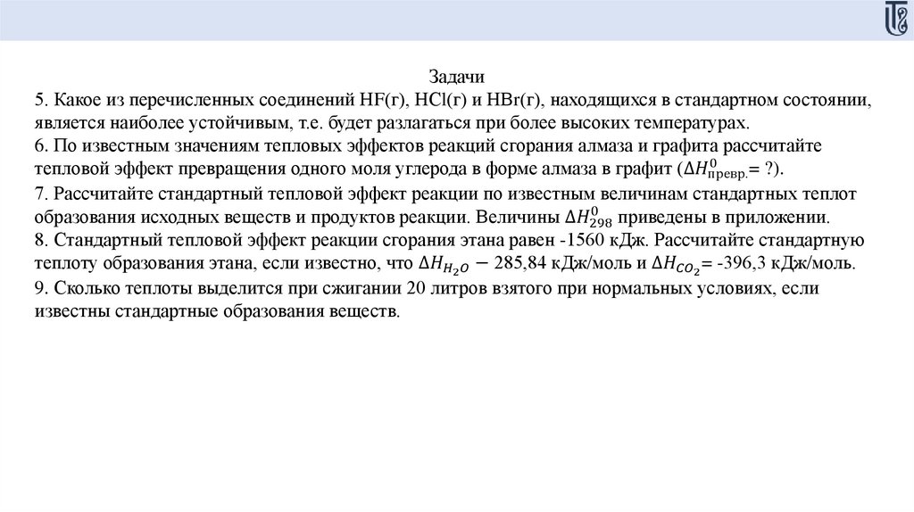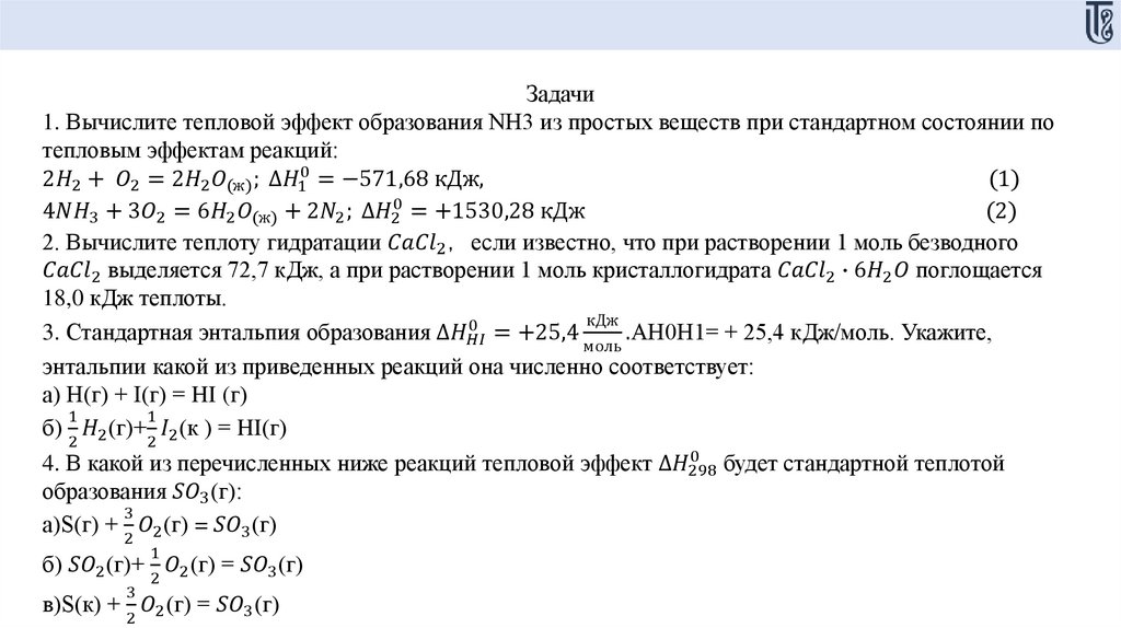 1. Вычислите тепловой эффект образования NH3 из простых веществ при стандартном состоянии по
