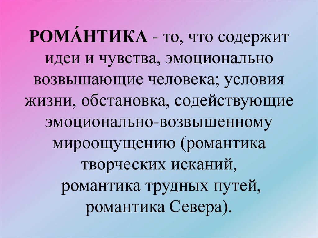РОМА́НТИКА - то, что содержитидеи и чувства, эмоционально