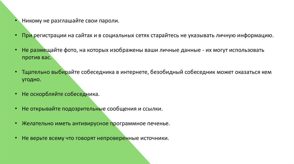 • Никому не разглашайте свои пароли.• При регистрации на сайтах и в социальных сетях старайтесь не указывать личную информацию.