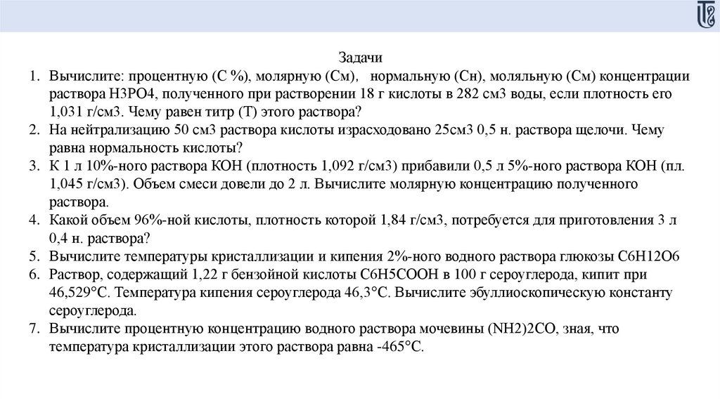 Задачи1. Вычислите: процентную (С %), молярную (См) нормальную (Сн), моляльную (См) концентрации