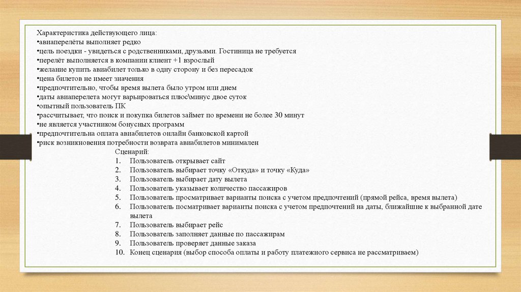 Характеристика действующего лица:•авиаперелёты выполняет редко
