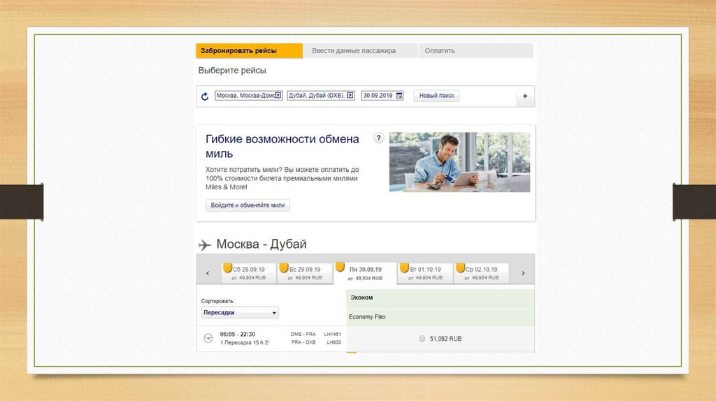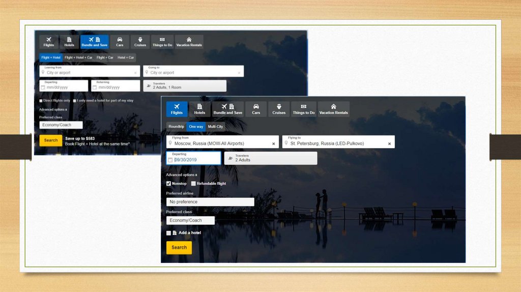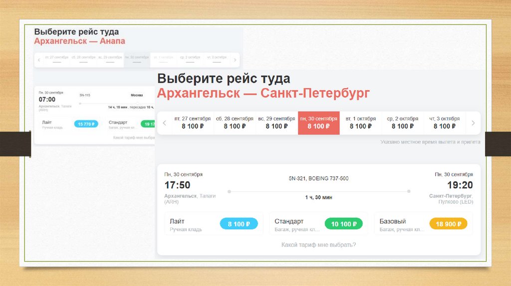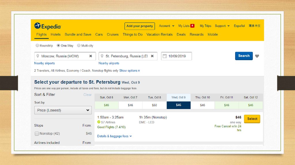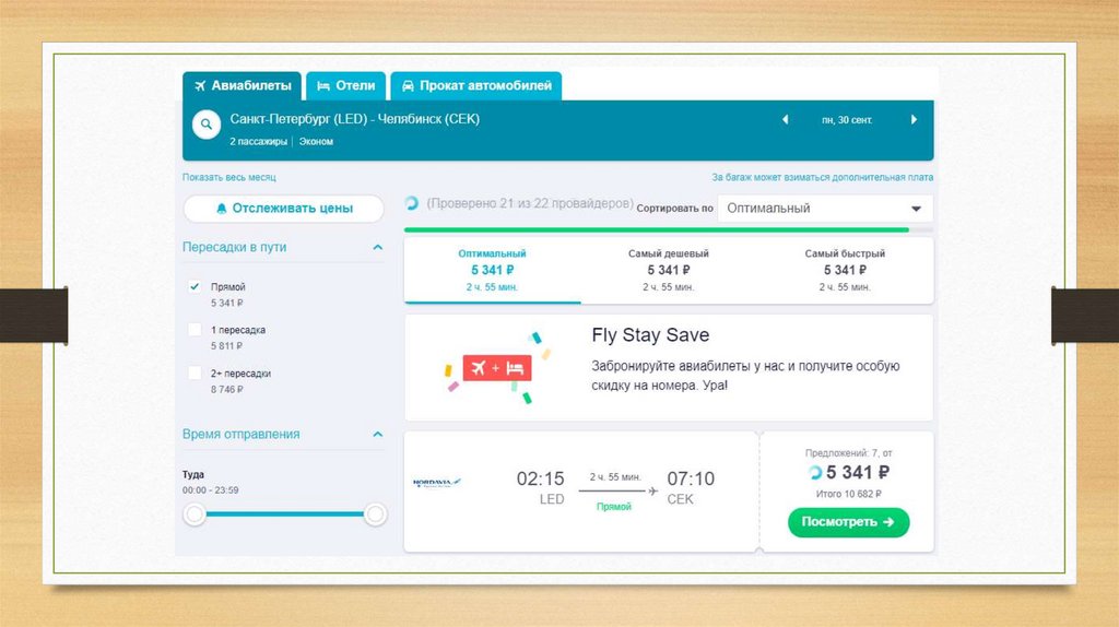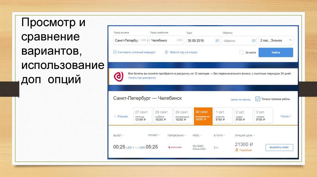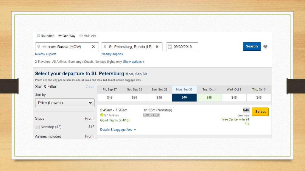 5. Пользователь просматривает варианты поиска с учетом предпочтений (прямой рейса, время вылета)