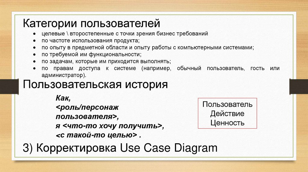 Категории пользователейцелевые \ второстепенные с точки зрения бизнес требований
