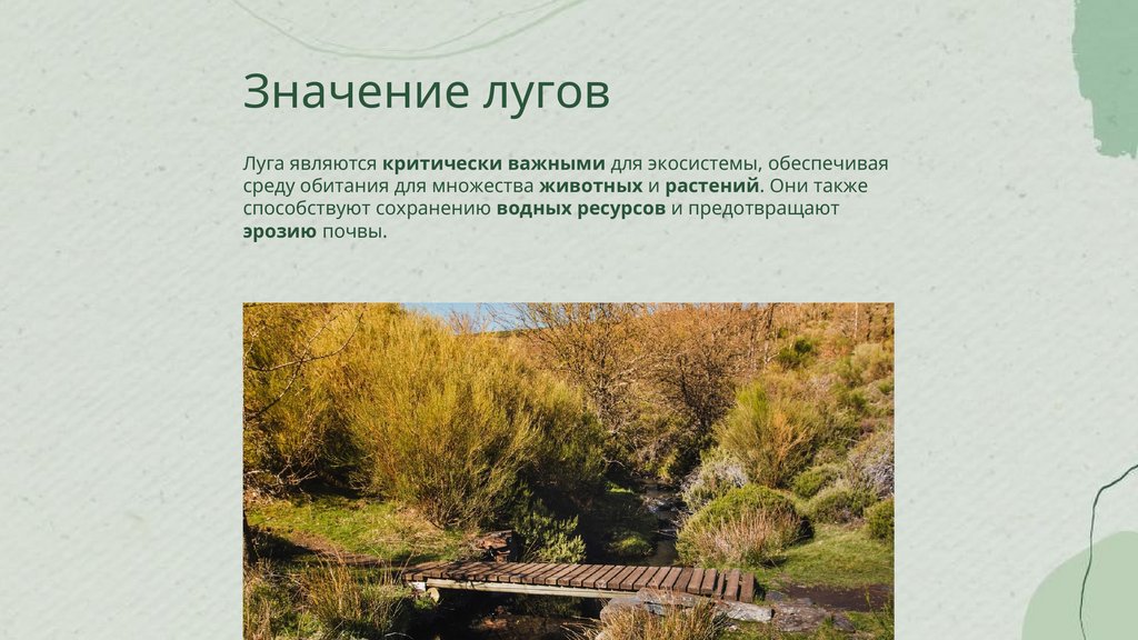 Значение луговЛуга являются критически важными для экосистемы, обеспечивая