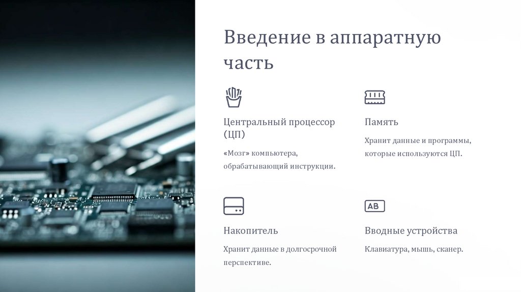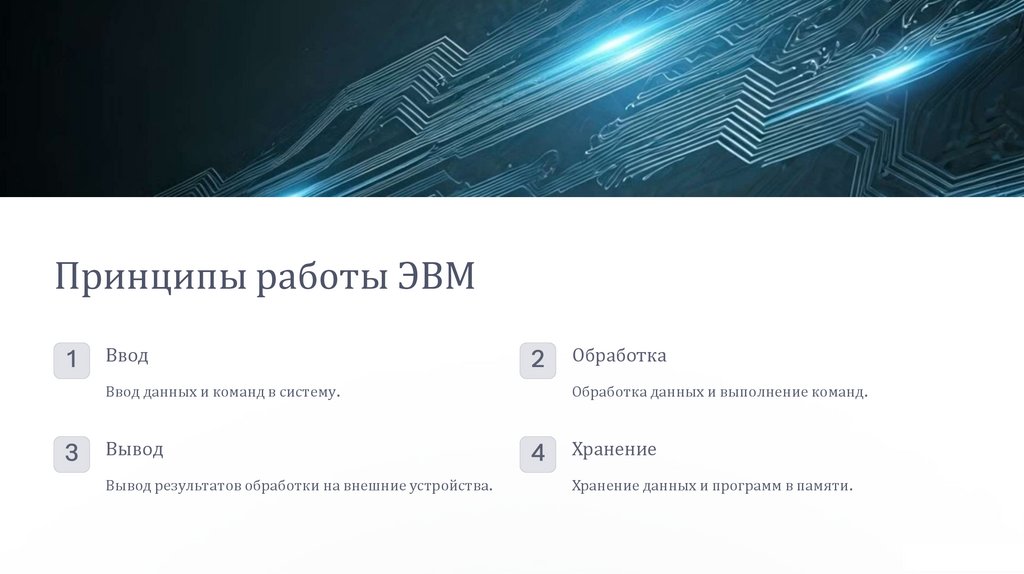 результаты в память. Вводные устройства позволяют пользователям вводить данные, а выводные устройства отображают