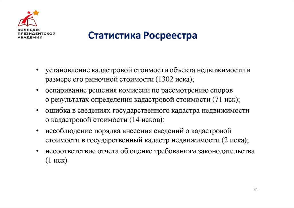 Статистика Росреестра• установление кадастровой стоимости объекта недвижимости в