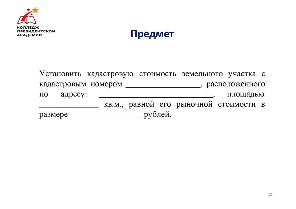 ПредметУстановить кадастровую стоимость земельного участка с