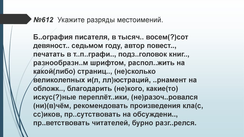 №612 Укажите разряды местоимений.Б..ография писателя, в тысяч.. восем(?)сот