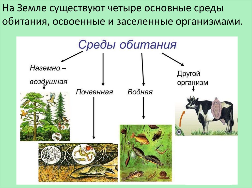 На Земле существуют четыре основные средыобитания, освоенные и заселенные организмами.