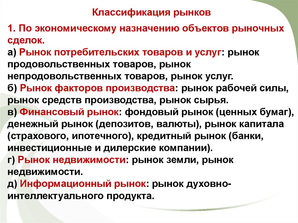 Классификация рынков1. По экономическому назначению объектов рыночных