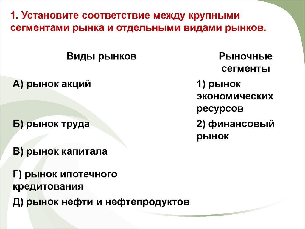 1. Установите соответствие между крупнымисегментами рынка и отдельными видами рынков.