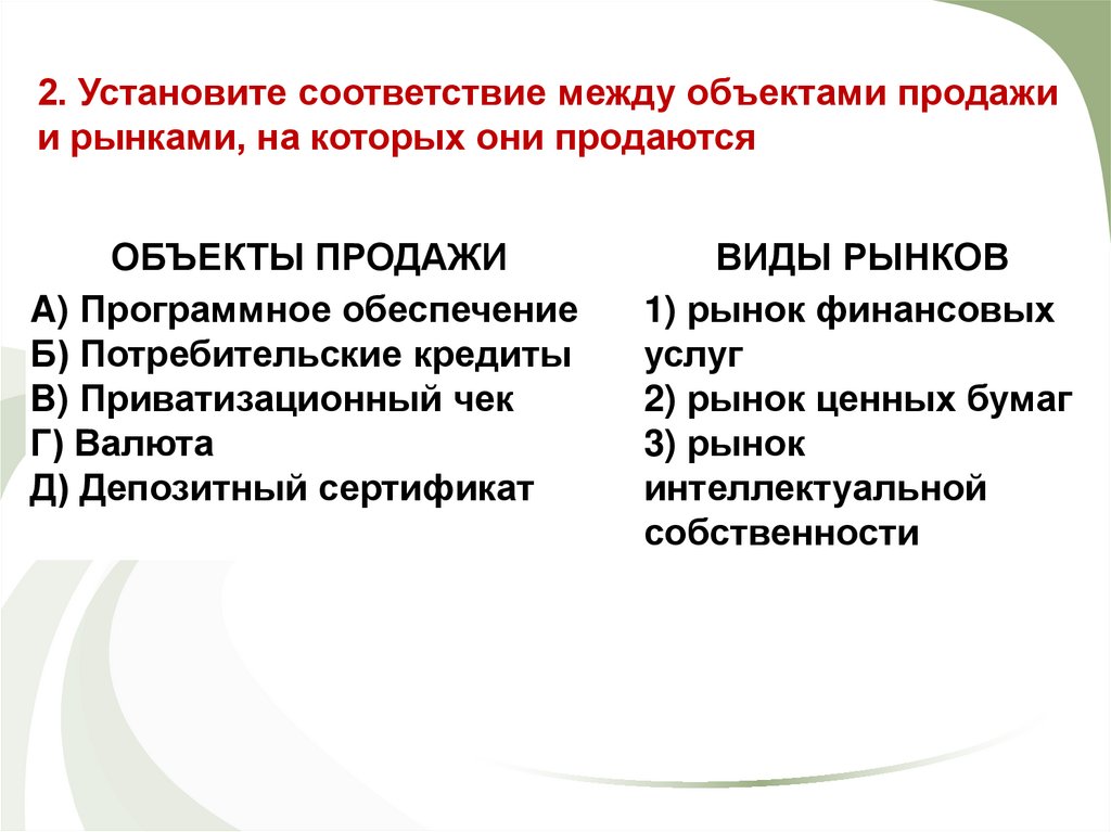 2. Установите соответствие между объектами продажии рынками, на которых они продаются