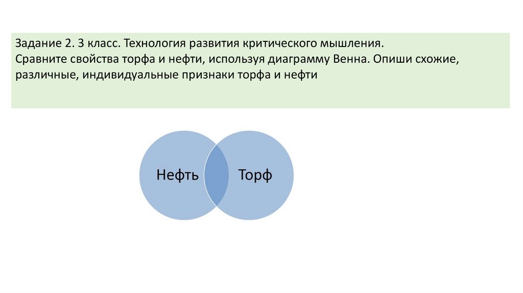 Задание 2. 3 класс. Технология развития критического мышления.Сравните свойства торфа и нефти, используя диаграмму Венна. Опиши схожие,