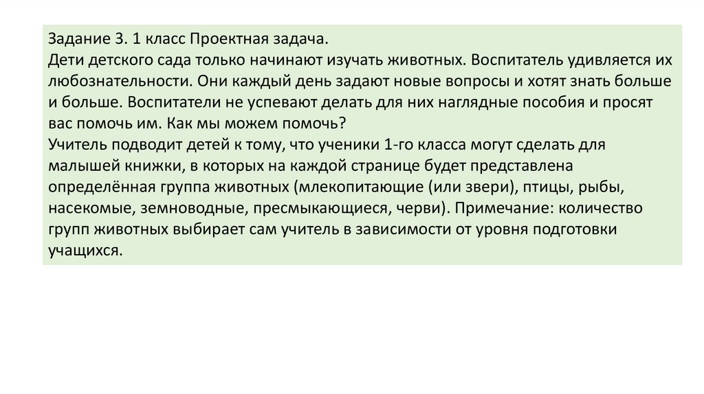 Задание 3. 1 класс Проектная задача.Дети детского сада только начинают изучать животных. Воспитатель удивляется их