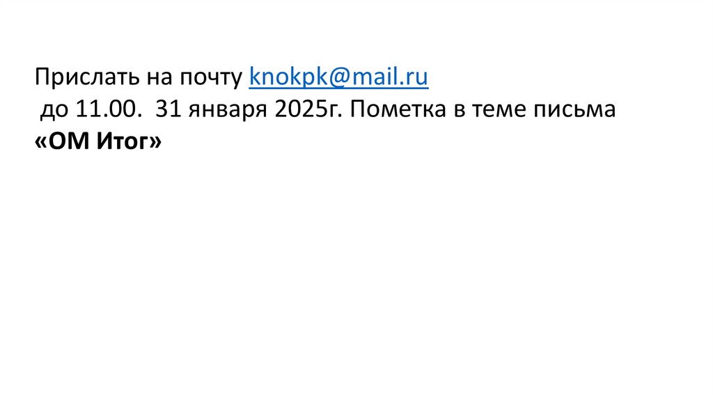 Прислать на почту knokpk@mail.ruдо 11.00. 31 января 2025г. Пометка в теме письма