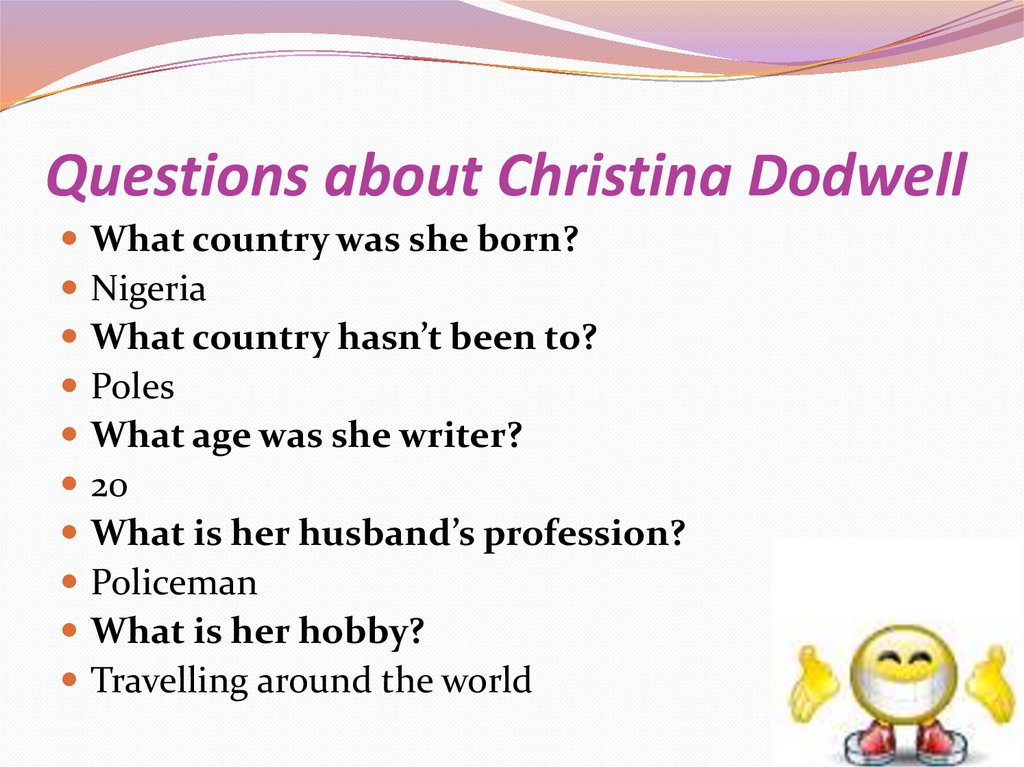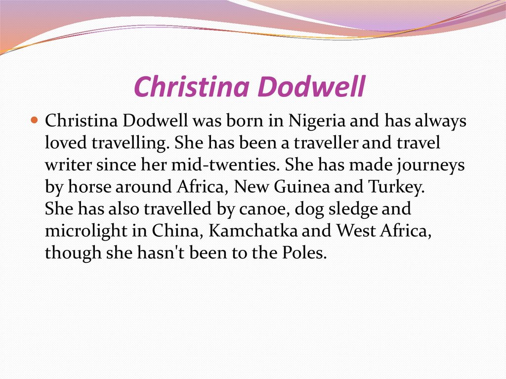 Christina DodwellChristina Dodwell was born in Nigeria and has always