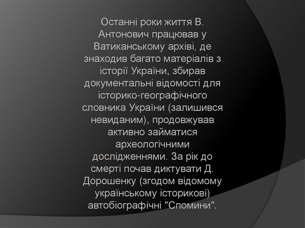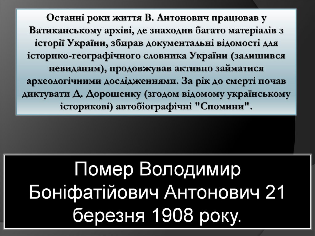 Останні роки життя В. Антонович працював уВатиканському архіві, де знаходив багато матеріалів з