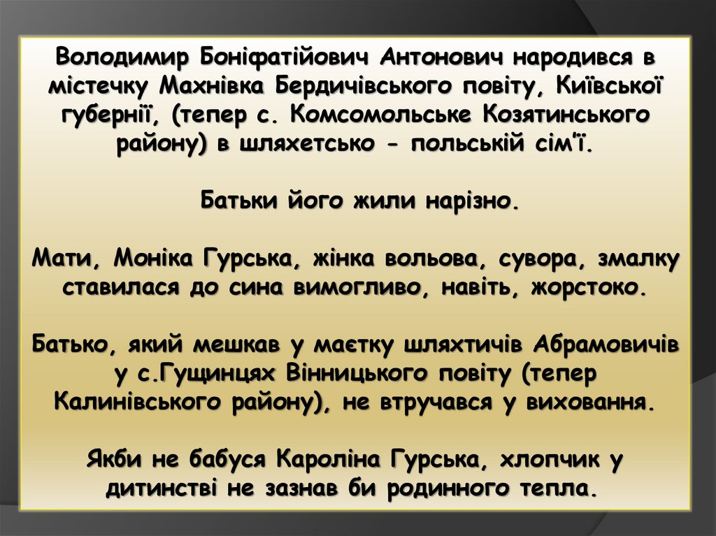 Володимир Боніфатійович Антонович народився вмістечку Махнівка Бердичівського повіту, Київської