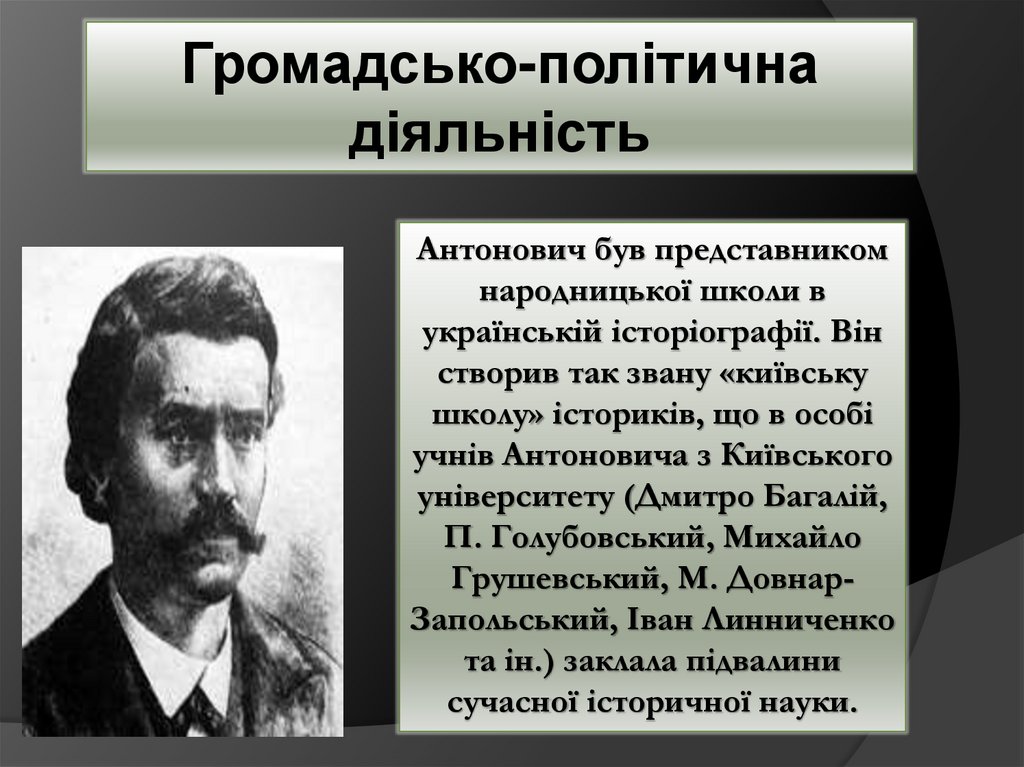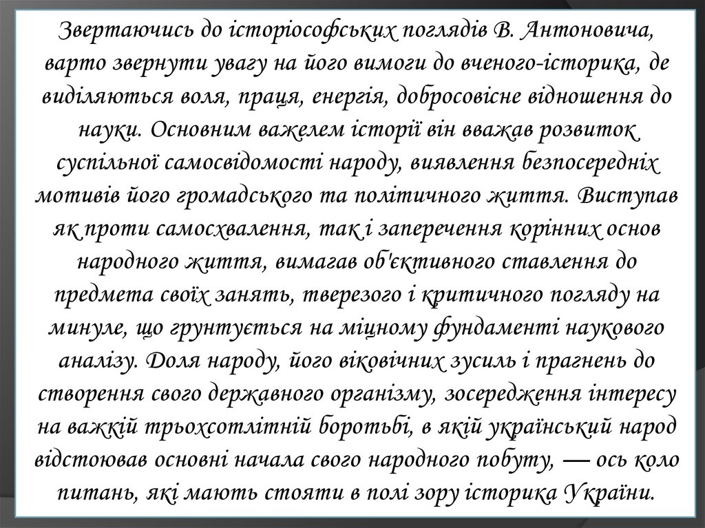 Звертаючись до історіософських поглядів В. Антоновича,варто звернути увагу на його вимоги до вченого-історика, де