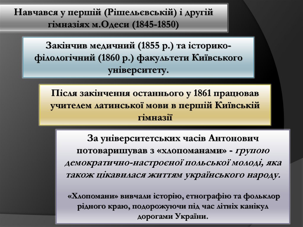 Закінчив медичний (1855 р.) та історикофілологічний (1860 р.) факультети Київського