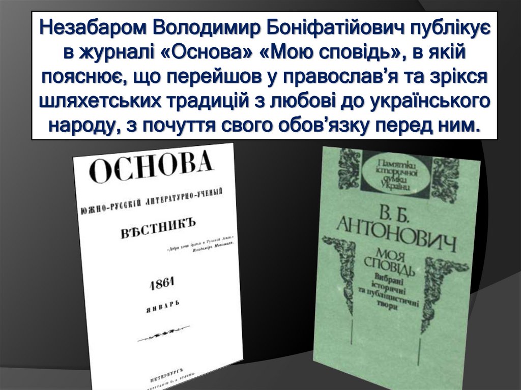 Незабаром Володимир Боніфатійович публікуєв журналі «Основа» «Мою сповідь», в якій
