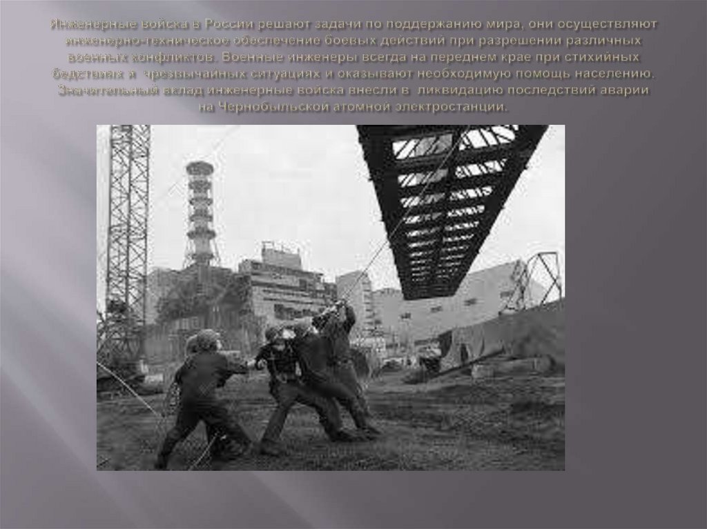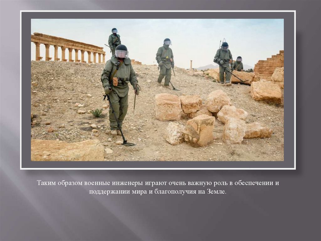 Таким образом военные инженеры играют очень важную роль в обеспечении иподдержании мира и благополучия на Земле.