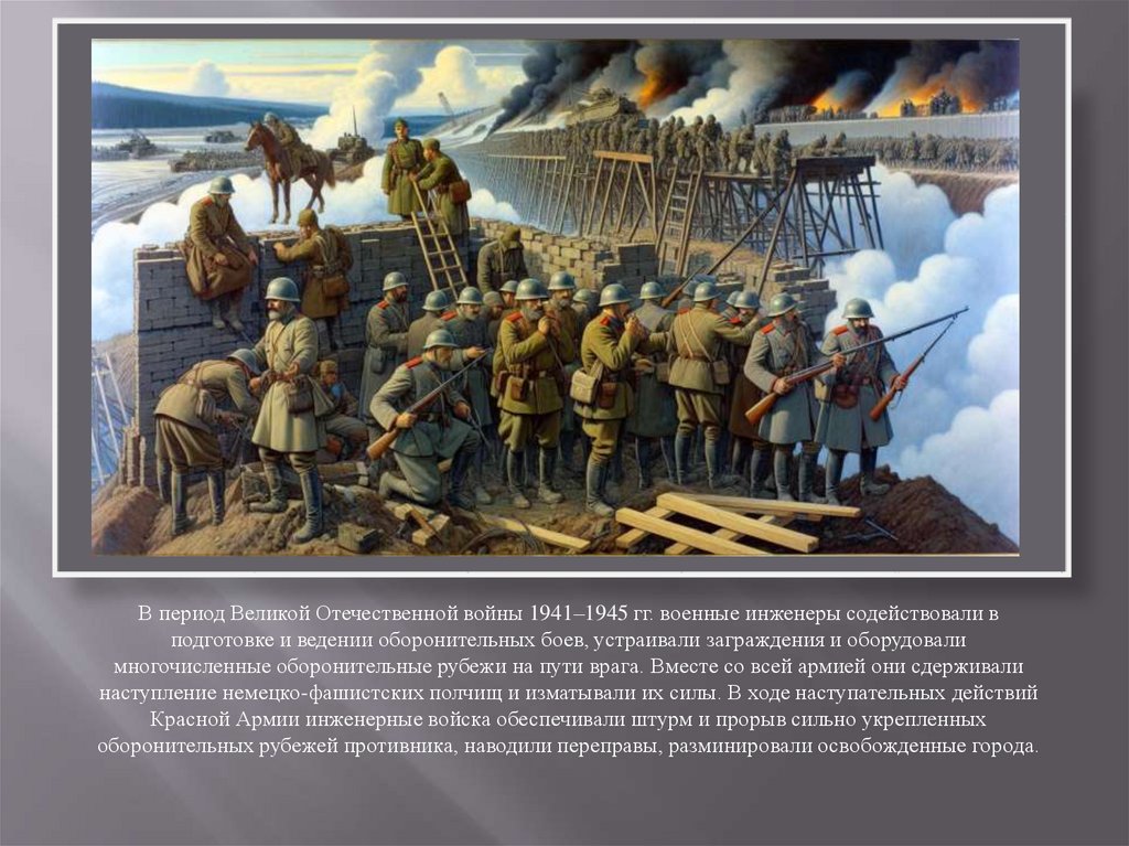 В период Великой Отечественной войны 1941–1945 гг. военные инженеры содействовали вподготовке и ведении оборонительных боев, устраивали заграждения и оборудовали