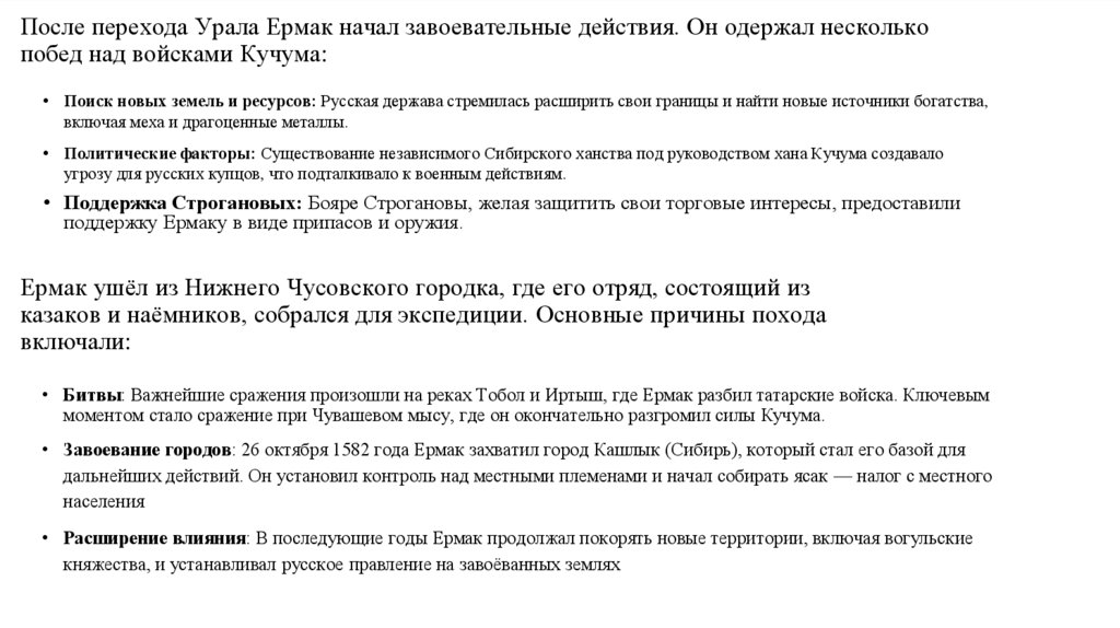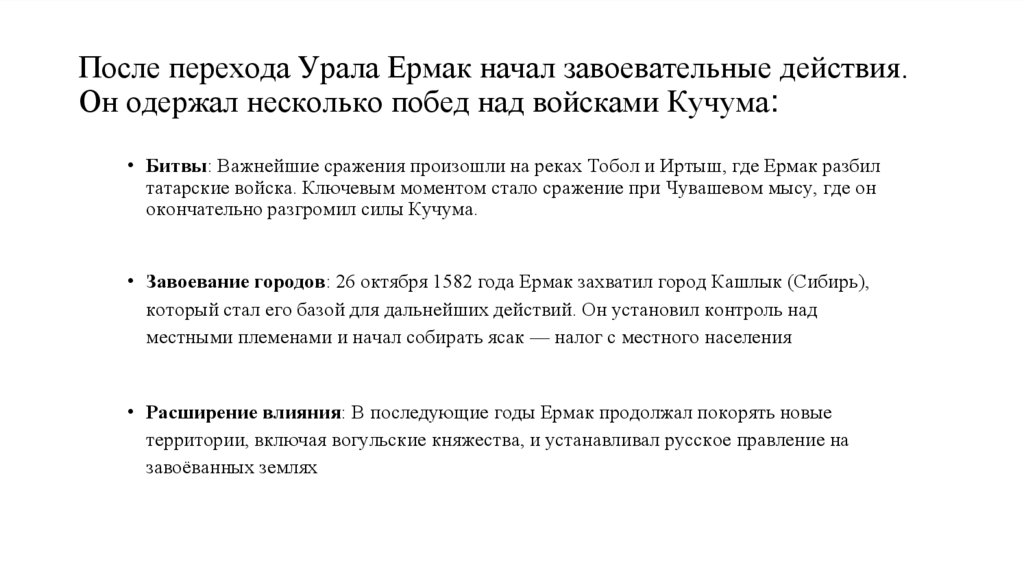 После перехода Урала Ермак начал завоевательные действия. Он одержал несколькопобед над войсками Кучума: