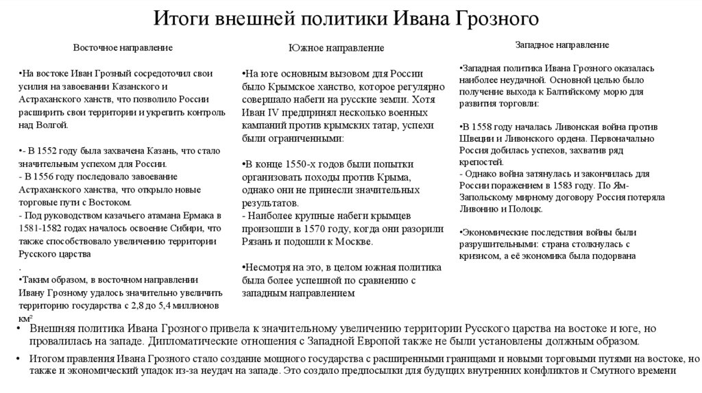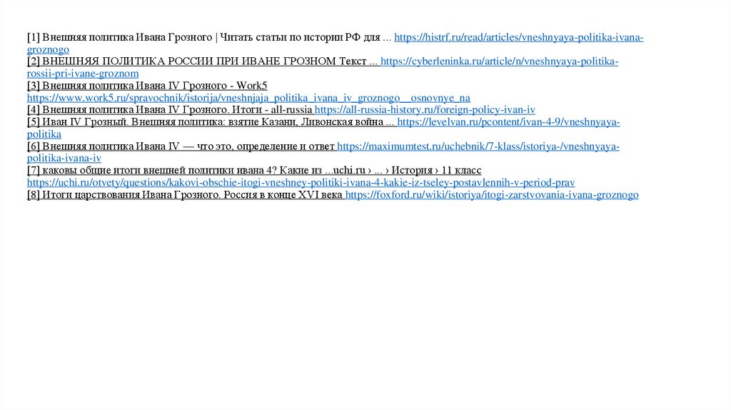 [1] Внешняя политика Ивана Грозного | Читать статьи по истории РФ для ... https://histrf.ru/read/articles/vneshnyaya-politika-ivanagroznogo[2] ВНЕШНЯЯ ПОЛИТИКА РОССИИ ПРИ ИВАНЕ ГРОЗНОМ Текст ... https://cyberleninka.ru/article/n/vneshnyaya-politikarossii-pri-ivane-groznom