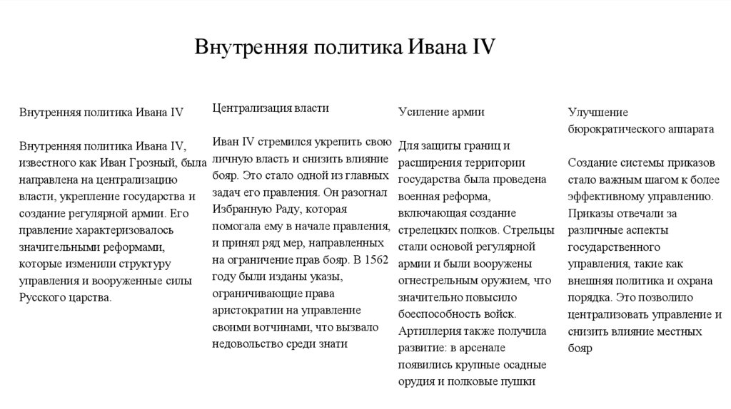 https://obrazovaka.ru/istoriya/vnutrennyaya-i-vneshnyaya-politika-ivana-groznogo-kratkaya-tablitca.html