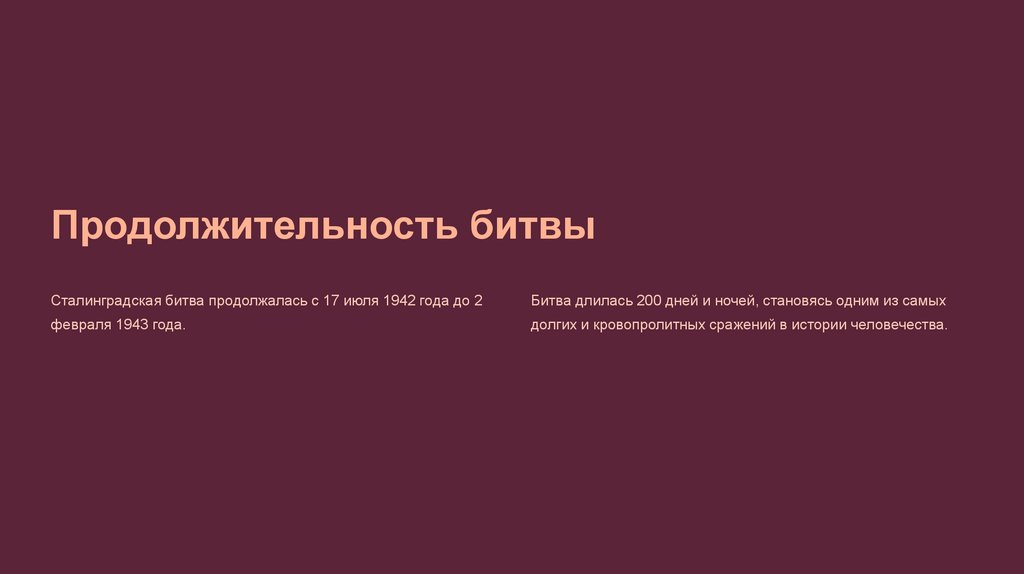 Продолжительность битвыСталинградская битва продолжалась с 17 июля 1942 года до 2