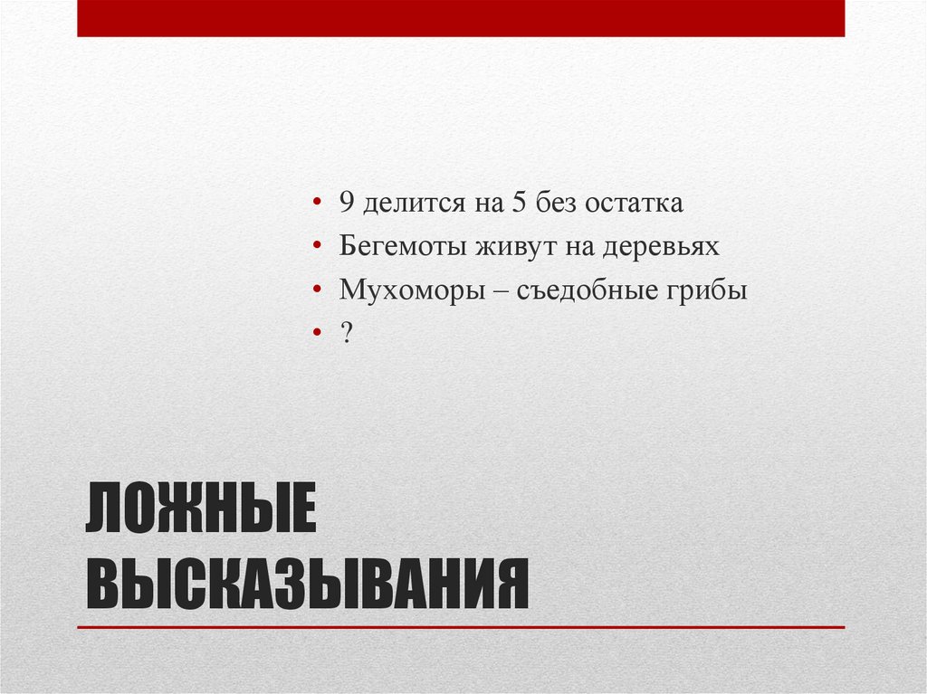 • 9 делится на 5 без остатка• Бегемоты живут на деревьях