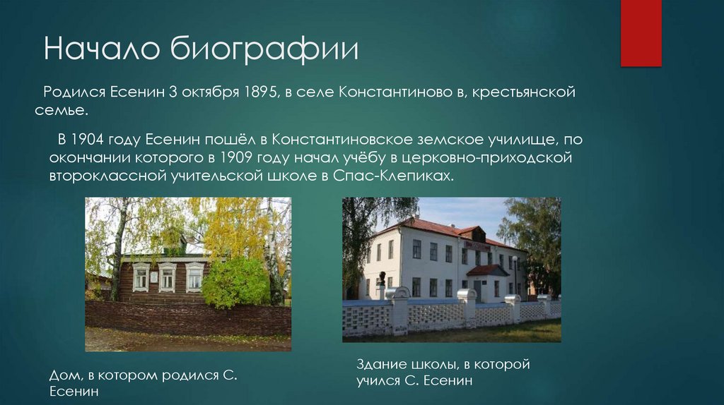 Начало биографииРодился Есенин 3 октября 1895, в селе Константиново в, крестьянской