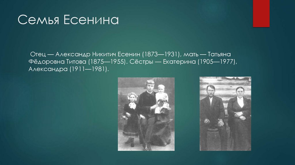 Семья ЕсенинаОтец — Александр Никитич Есенин (1873—1931), мать — Татьяна