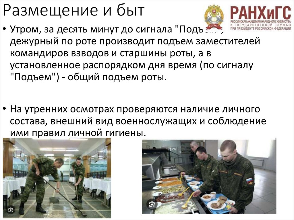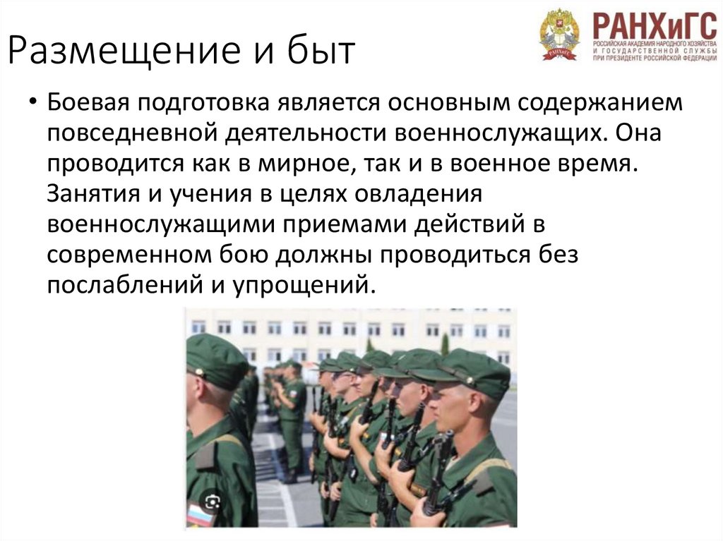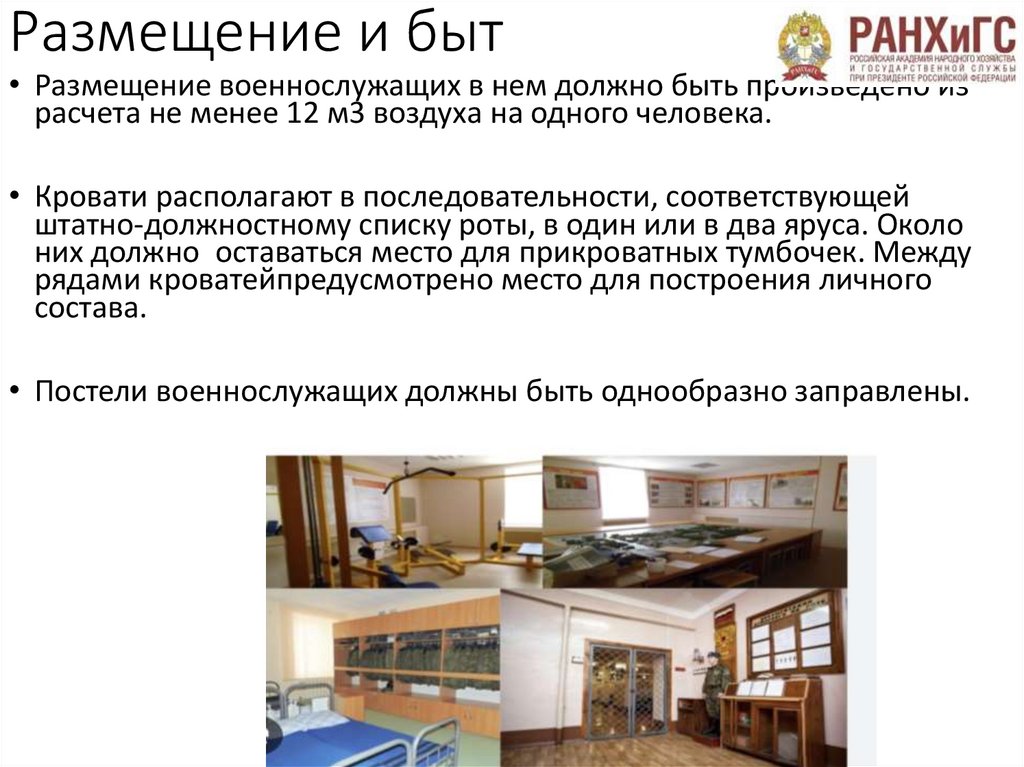 Размещение и быт• Размещение военнослужащих в нем должно быть произведено из