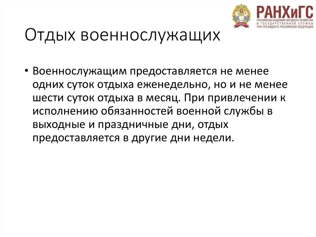 Отдых военнослужащих• Военнослужащим предоставляется не менее