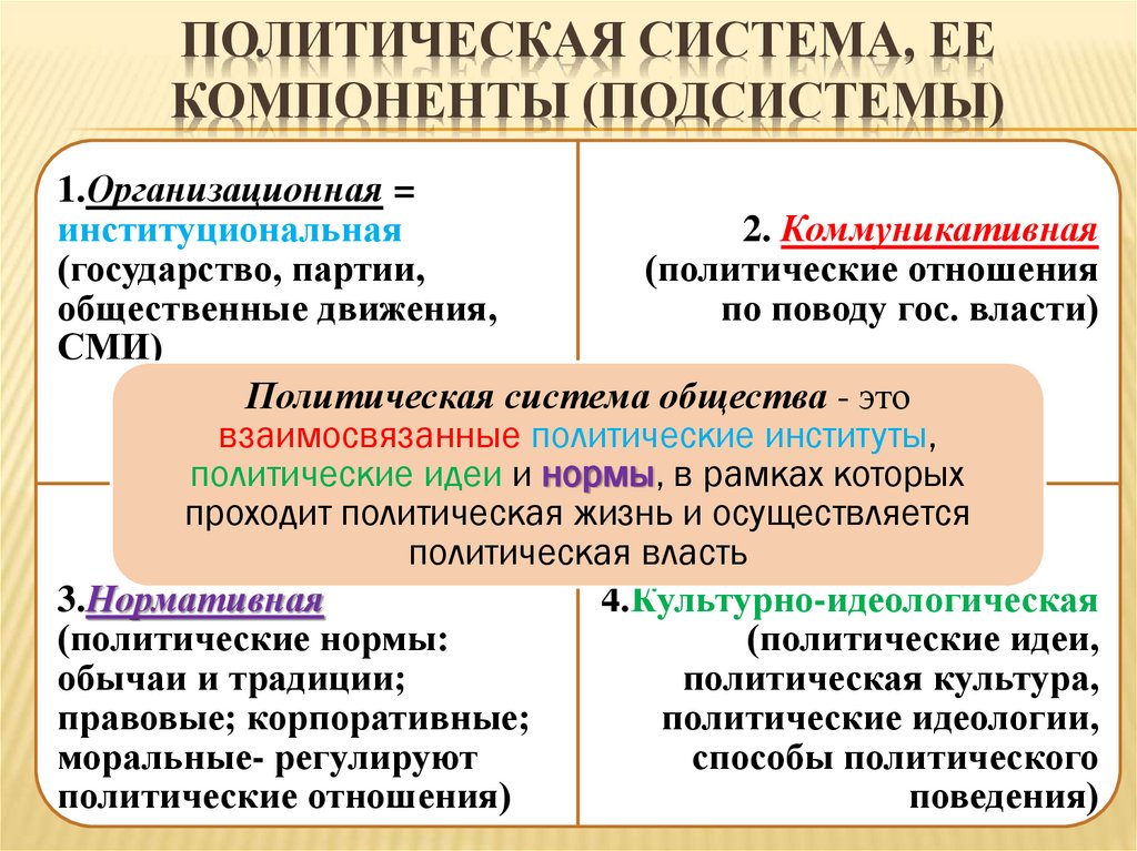 ПОЛИТИЧЕСКАЯ СИСТЕМА, ЕЕКОМПОНЕНТЫ (ПОДСИСТЕМЫ)