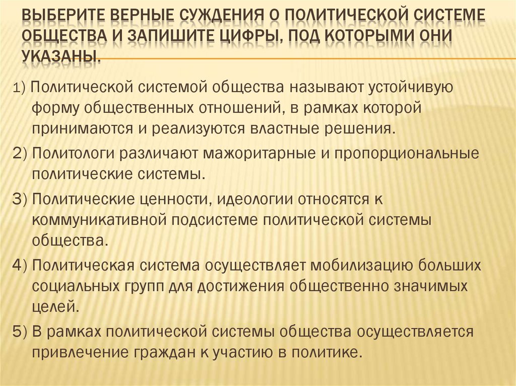 ВЫБЕРИТЕ ВЕРНЫЕ СУЖДЕНИЯ О ПОЛИТИЧЕСКОЙ СИСТЕМЕОБЩЕСТВА И ЗАПИШИТЕ ЦИФРЫ, ПОД КОТОРЫМИ ОНИ