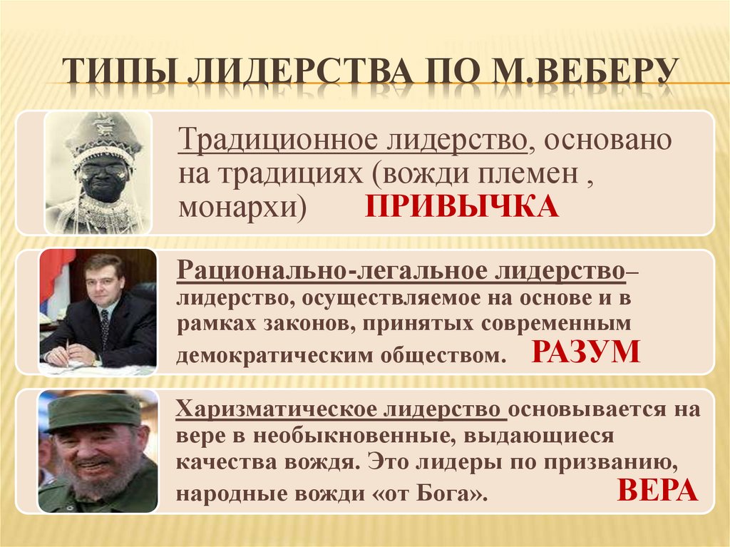 ТИПЫ ЛИДЕРСТВА ПО М.ВЕБЕРУТрадиционное лидерство, основано