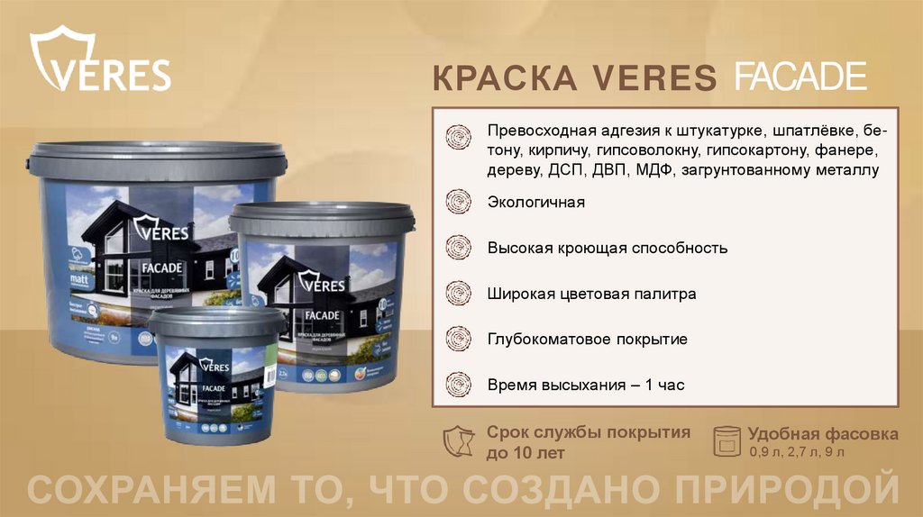 КРАСКА VERES FACADEПревосходная адгезия к штукатурке, шпатлёвке, бетону, кирпичу, гипсоволокну, гипсокартону, фанере,