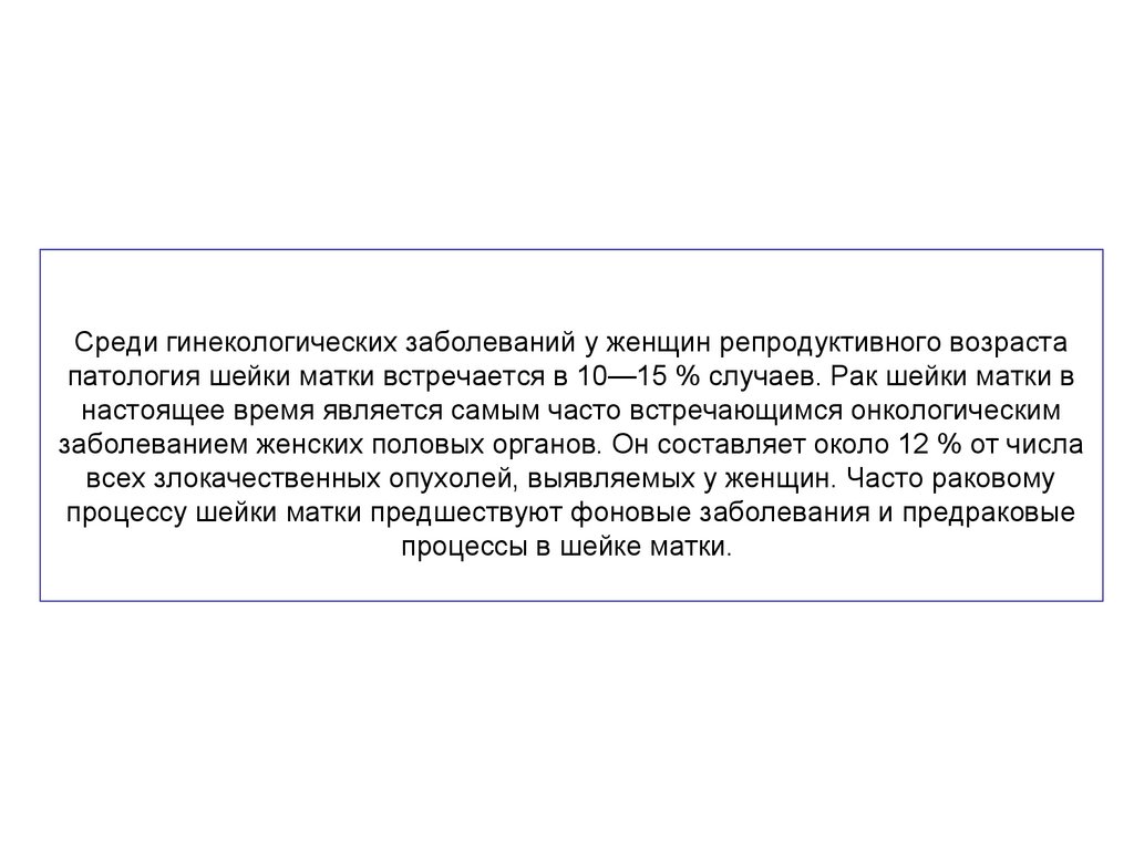 Среди гинекологических заболеваний у женщин репродуктивного возрастапатология шейки матки встречается в 10—15 % случаев. Рак шейки матки в